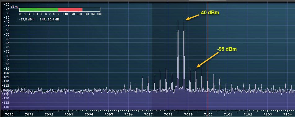Запись с 40м. На скриншоте отмечена область где работает пороговая АРУ, в остальных местах - логарифмическая