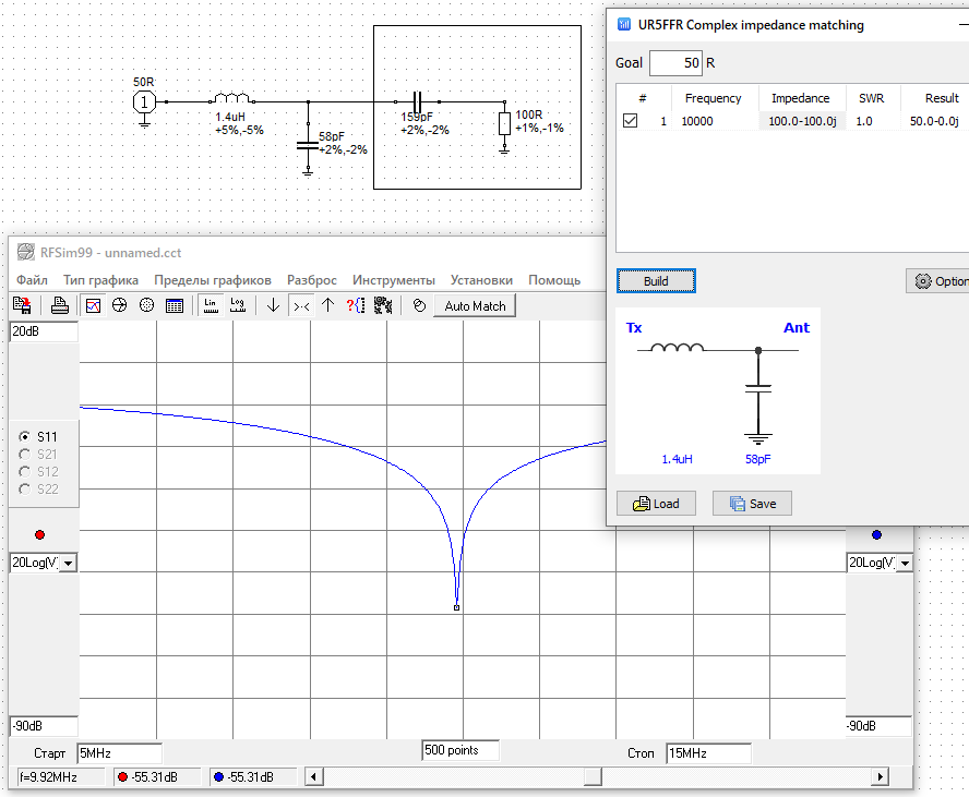 Для примера была выбрана нагрузка (антенна) с импедансом 100-100j на частоте 10МГц, что соответствует 100ом+159пф, рассчитана цепь согласования и ее проведена проверка в RFSimm