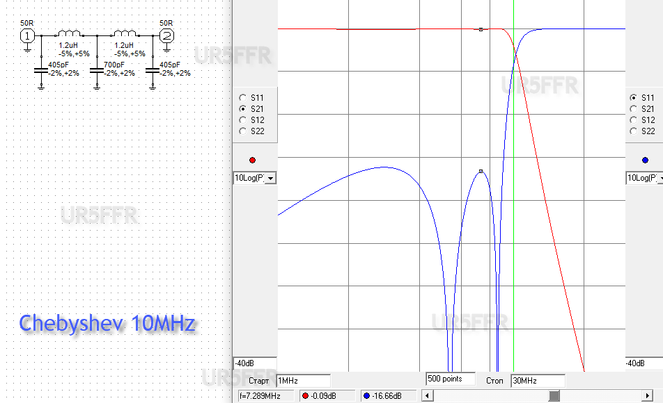 Вот например для частоты среза 10МГц по уровню 3дб получаем такой фильтр