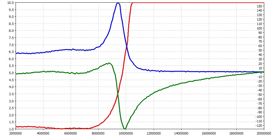 Фильтр нагружен на эквивалент нагрузки 50ом, входной импеданс и ксв измерен с помощью векторного анализатора. На графиках синий - R, зеленый - X, красный - КСВ. Результаты полностью соответствуют расчетным
