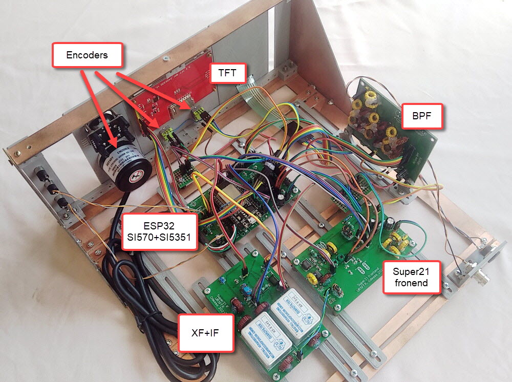 Вся дальнейшая обработка выполняется в ESP32. Кроме DSP процессор выполняет все обычные функции по управлению трансивером и синтезаторами, которых используется два - SI570 и SI5351. Отображается информация на 3.2" TFT ILI9341 с разрешением 320*240. Для управления используется 16ти кнопочная клавиатура, основной оптический валкодер для перестройки по частоте и два сервисных механических валкодера для управления громкостью, частотой среза ФНЧ, расстройкой и параметрами АРУ.