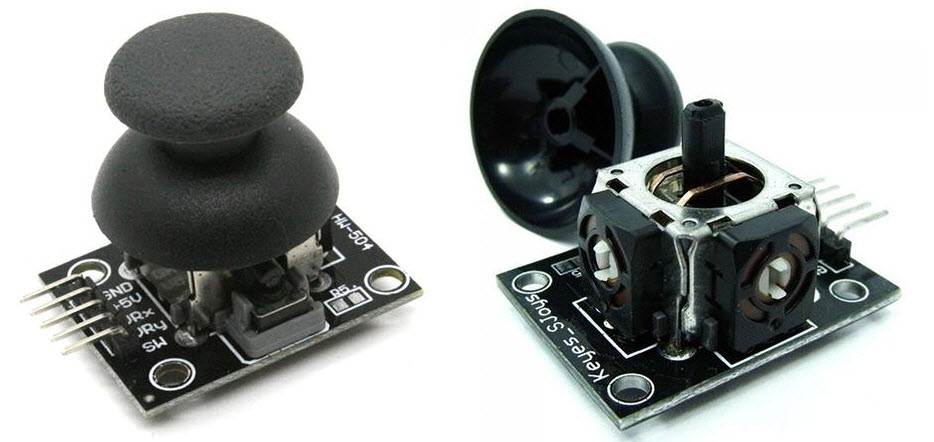 На али достаточно недорого продаются модули джойстиков. Такой модуль состоит из двух переменных резисторов, кнопки и механики, которая обеспечивает возврат указателя в центральное положение.