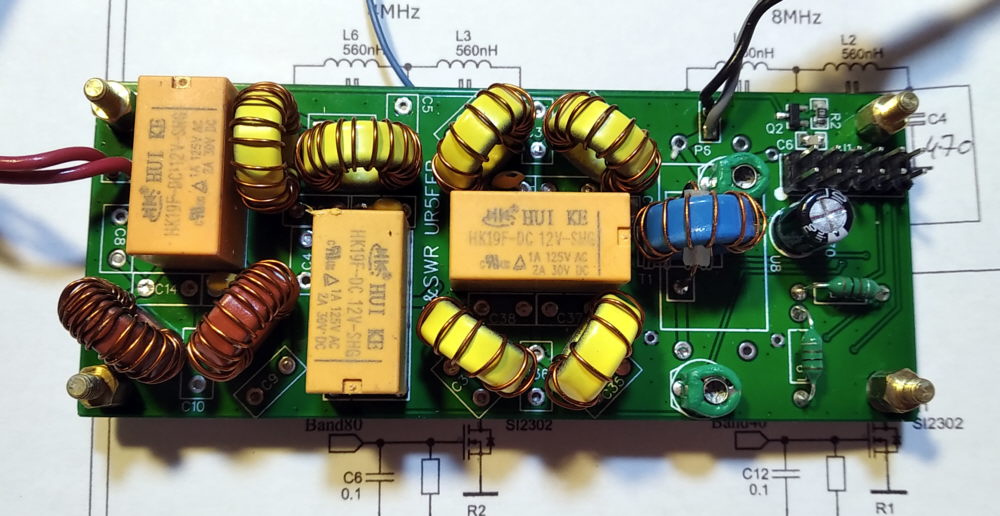Используются двухзвенные ФНЧ. Номиналы конденсаторов в пробках подобраны экспериментально на основании измерений АЧХ. Все катушки в фильтрах намотаны на кольцах T50. Плата изначально делалась под выводные конденсаторы и туда становятся впритирку КСО-1. Но оказалось что в имраде по сравнительно вменяемой цене есть NP0 смд 1206 на 1кв. Они и были установлены. Так как некоторые номиналы там по фантастическим ценам то они собирались параллельно из нескольких конденсаторов. Например 1800=1000+470+330, 820=470+330