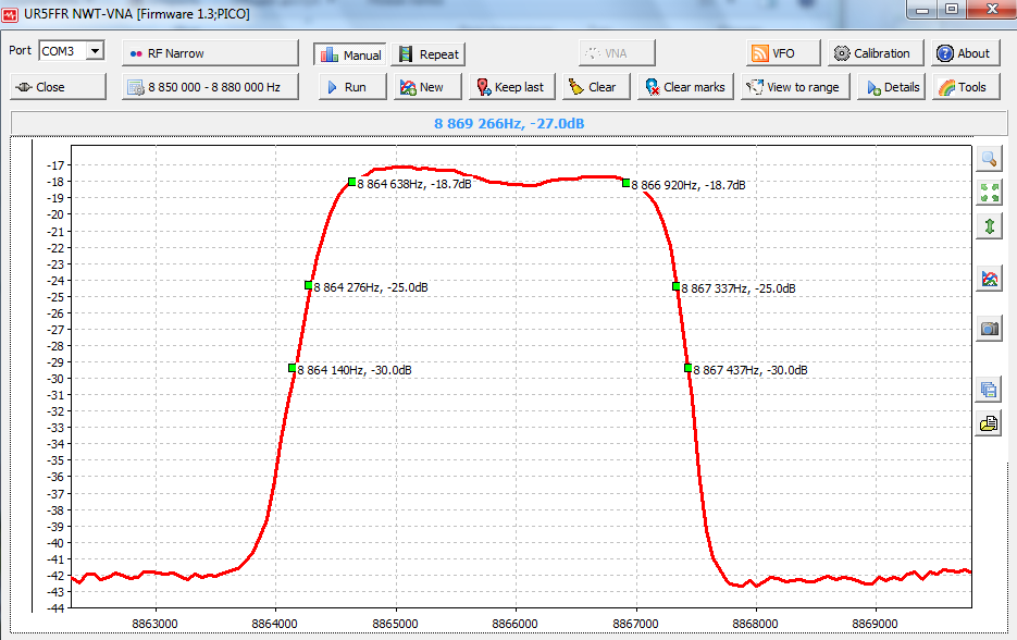 Большое спасибо за подсказку! Правда во время всех замеров и изготовлении первого своего фильтра не совсем понимаю некоторые моменты. Подскажите пожалуйста по данному фильтру. Можно ли в таком виде его применять? Так же не совсем понимаю какую частоту нужно взять из данного графика и прописать в прошивку синтезатора? В синтезаторе и ГПД и ПЧ прописываются одинаковой частотой. И верхняя и нижняя боковая. Планирую применить этот фильтр в Аматоре вместо ЭМФ.