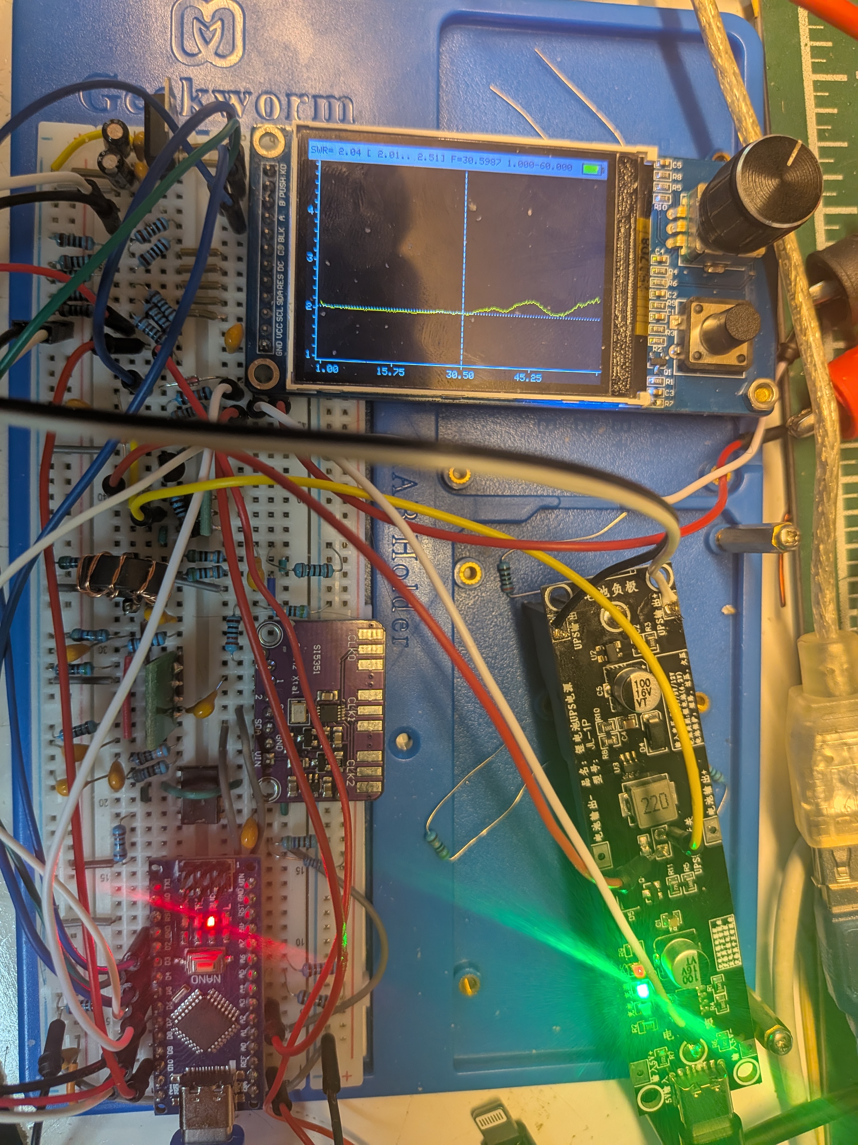 После прошивки и рестарта на выходе анализатора должен быть сигнал частотой 3МГц амплитуой порядка 100мв. Контролируем постоянное напряжение на стоке BF998 - оно должно быть около 2.5в. При значительном отклонении подбираем номинал R18. На С7 должен присутствовать синус частотой 1кГц.