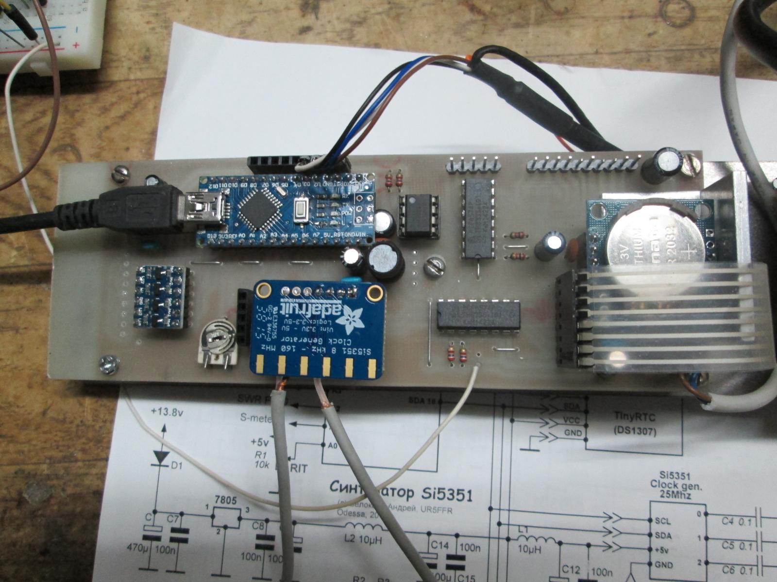 Ivan Petkov LZ2INP немного модернизировал схему и разработал печатную плату. Модернизация сводится к использованию микросхем PCF8574 для опроса клавиатуры и управления ДПФ/Att/PreAmp. Плата предназначена для установки модуля Si5351 от Adafruit, который содержит "на борту" встроенный преобразователь уровней 3,3/5в. В схеме использована плата Arduino Nano. Полный комплект документации в атаче