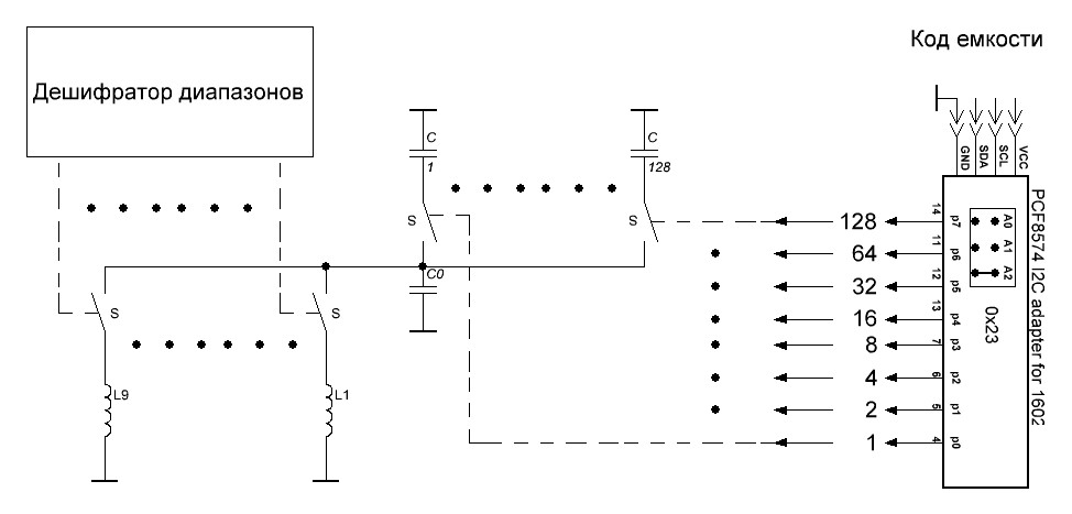 ДПФ (как сейчас), и емкостей матрицей кондеров С-2С от отдельного коммутатора с квадратной шиной. В скетче забиваем индуктивности (по одной на диапазон), и по формуле Томпсона ардуинка считает необходимую емкость и коммутирует кондюки. Восьми разрядов хватает за глаза для перекрытия даже 2х мегагерц на нижних диапазонах.