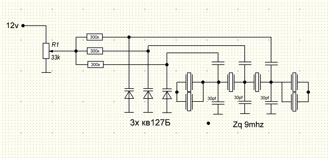 PS кстати движок переменного резистора надо на землю через конденсатор 0,1u, а номиналы резисторов в цепях смещения варикапов уменьшить с 300ком до 20-30ком