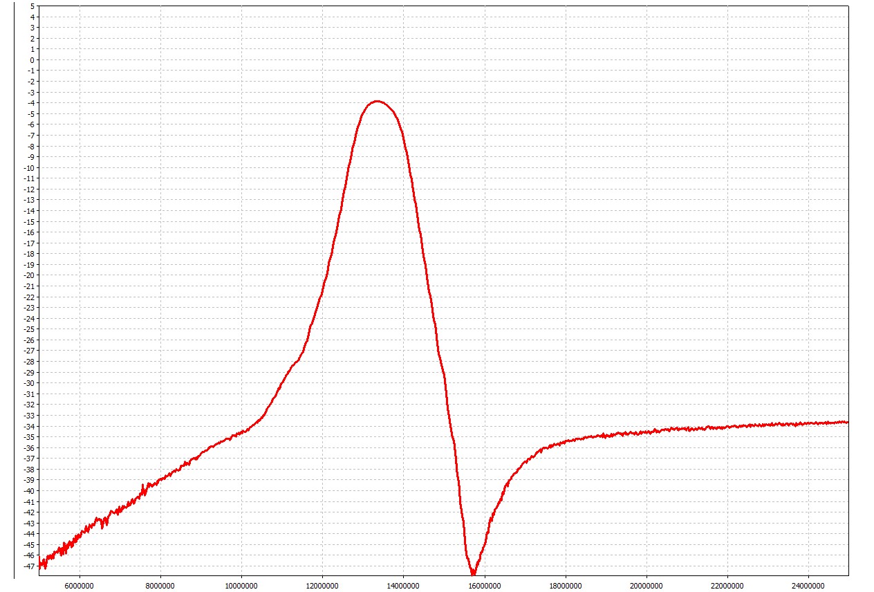Тоже всё как заявлено в описании. Подключил ДПФ на 20м. Он ещё не в диапазоне, но это сейчас не главное. Получил полку за полосой пропускания. Пролаз ВЧ в обход фильтра.