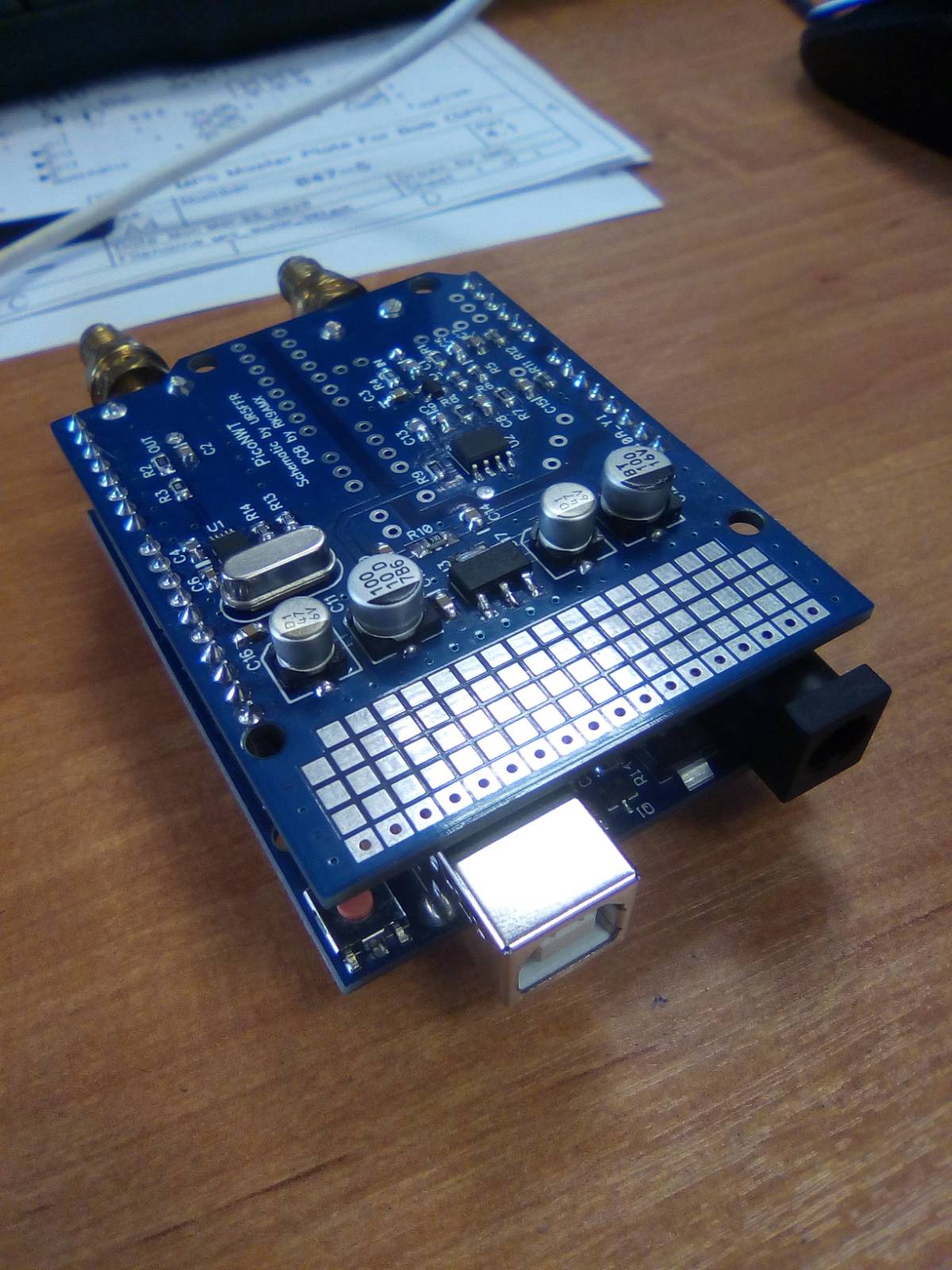 Немного подправил шелкографию и футпринт под конденсаторы. SMA-разъём заложил более доставаемый, по сравнению с первой версией. Во вложениях исправленная ПП, сборочник и схема.