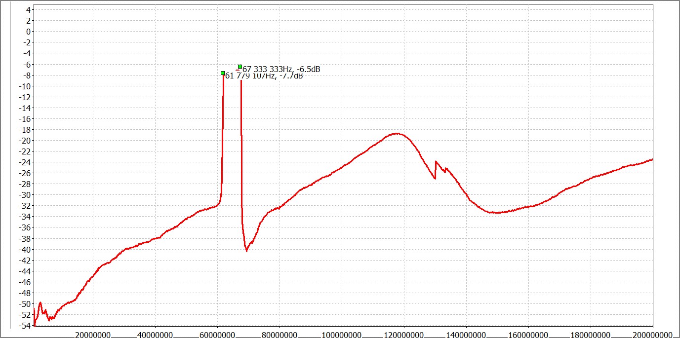 в районе 67 мггц. Подключал и к PC и к ноутбуку, внешний источник питания, никакой разницы.