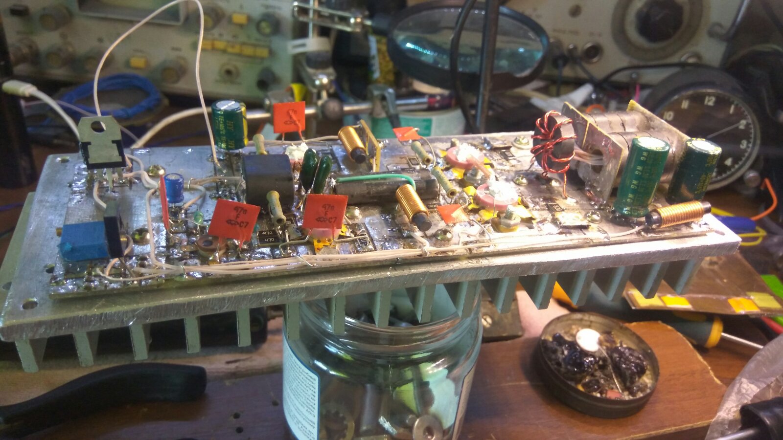 Вроде как все заработало. Есть чуток завал на 10ке, но еще не готов УВЧ на него, мало для этой схемки раскачки с сишки, да и напруга на сишке проседает после 21мгц. Попробую сделать на кт610 увч и посмотрим чо получится. Ну а так то 50 ватт на 80 отдает, и чуток поменьше практически до 21 мгц... С увч думаю 100 будет, хотя это занадто ) хватит и 50-60.