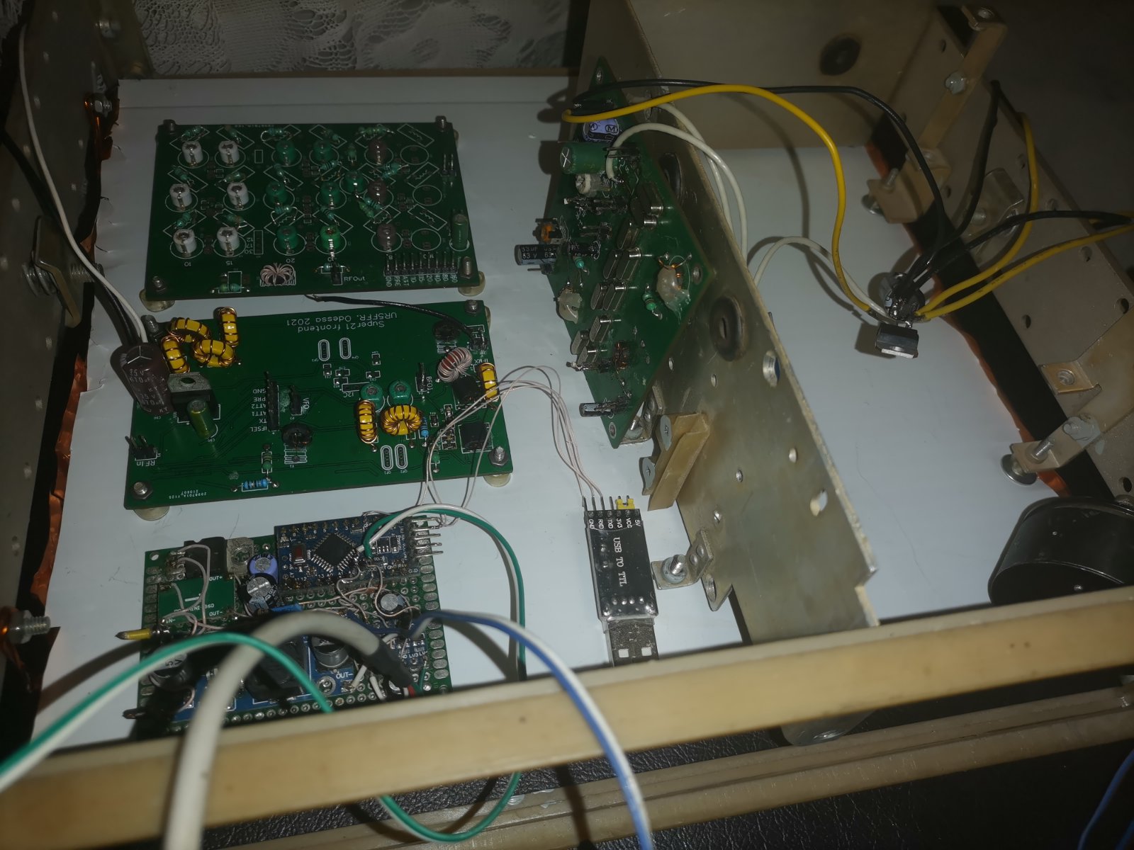 На сегодня все, устал до чертиков, еще и пиваса принял... закрепил две платы, одну надо вертикально ставить ну и плату с адуриной надо закрепить и так чтобы экранировать можно ее было, ибо ну нафик будет!
