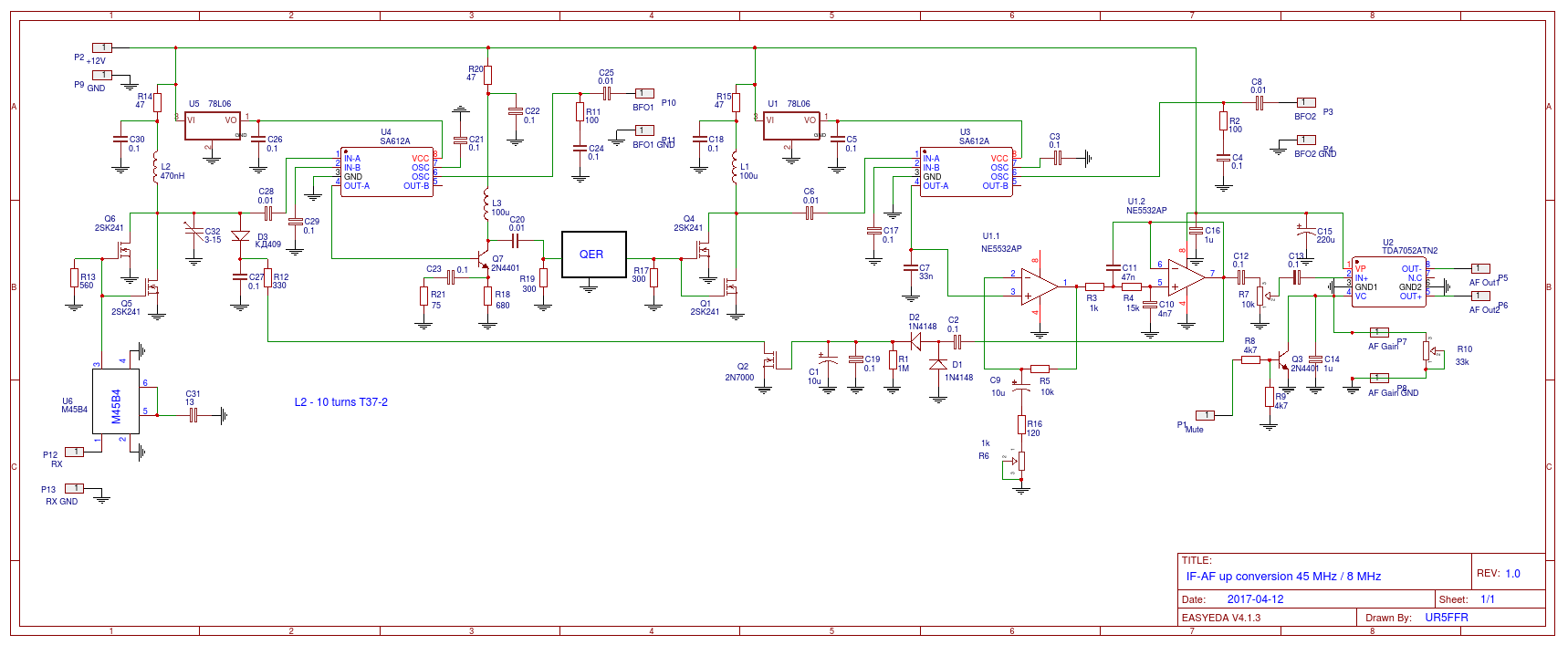 Тракт ПЧ-НЧ сделан по мотивам трансивера "Стрекоза" [3]. После смесителя сигнал с ПЧ 45 MHz попадает на кварцевый фильтр. Я применил фильтры M45B4 с полосой пропускания 7.5 kHz, но могут быть применены любые промышленные фильтры на соответствующие частоты и импедансом порядка 400-600 ом. Например 45K15B или аналогичные. Фильтр согласован по выходу с помощью резистора R13, сопротивление которого равно рекомендуемому сопротивлению нагрузки для примененного фильтра.