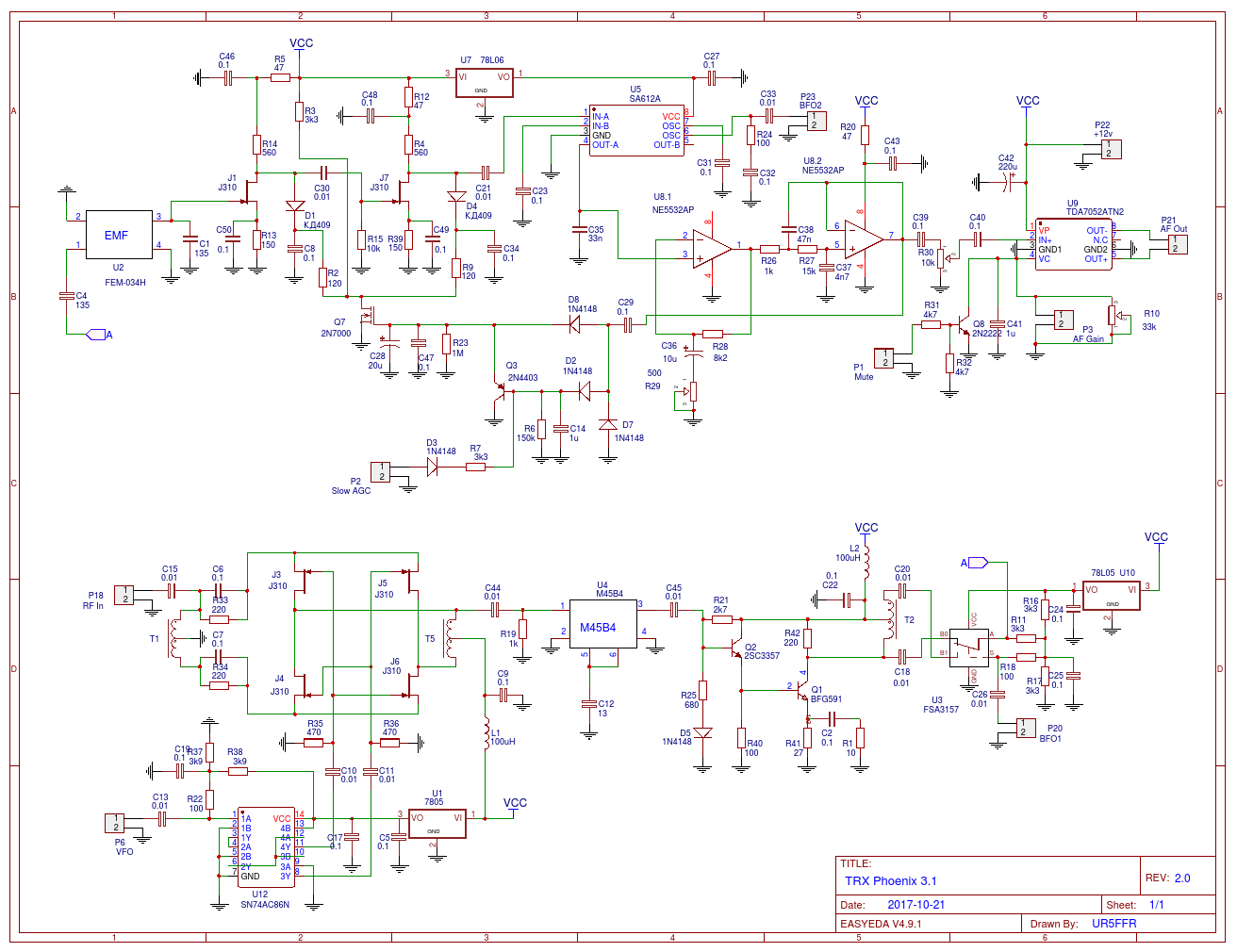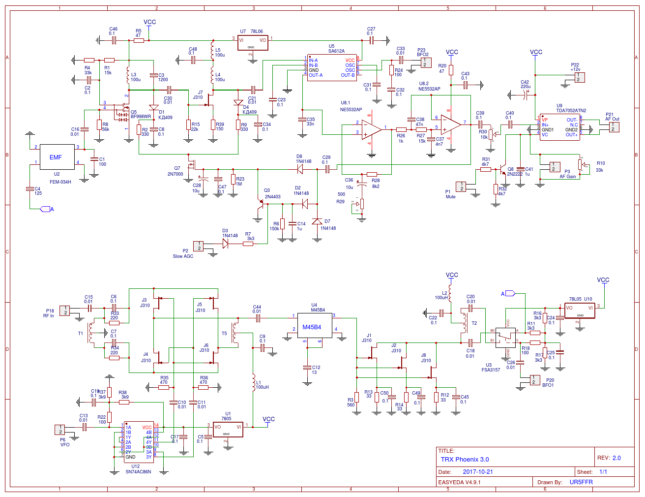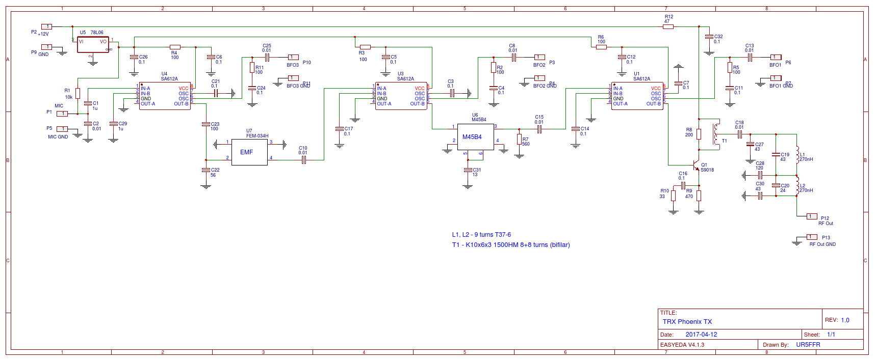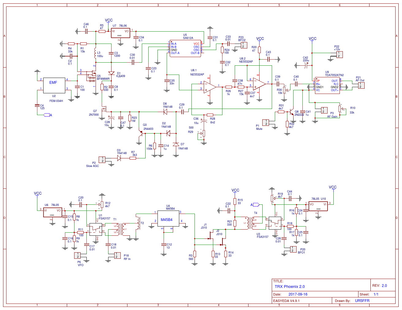 Целью конструирования трансивера "Феникс" было создание простого в повторении тракта, требующего минимум настроек. Исходя из доступности фильтров была выбрана раскладка 1я ПЧ - 45 MHz, вторая ПЧ - 500 kHz. В качестве фильтра по 1й ПЧ используется любой заводской фильтр на 45 MHz с сопротивление около 600 ом. ФОС по 2й ПЧ - ЭМФ. Так как фильтры промышленные, то не составляет сложности приобрести их несколько одинаковых. А это приводит к трансиверу с полностью раздельными трактами приема и передачи, которые используют идентичные фильтры. Такая конструкция упрощает схемотехнику т.к. отпадает необходимость в цепях коммутации по ВЧ. Если при низких частотах ПЧ коммутация не вызывает существенных проблем, то при частоте ПЧ 45 MHz и выше падает развязка в тракте. Так же если ознакомиться со схемотехникой зарубежных промышленных аппаратов то у всех у них тракты максимально раздельные. Это лишний раз подтверждает что направление выбрано правильно. Некоторое избыточное количество деталей с лихвой окупается простотой настройки.