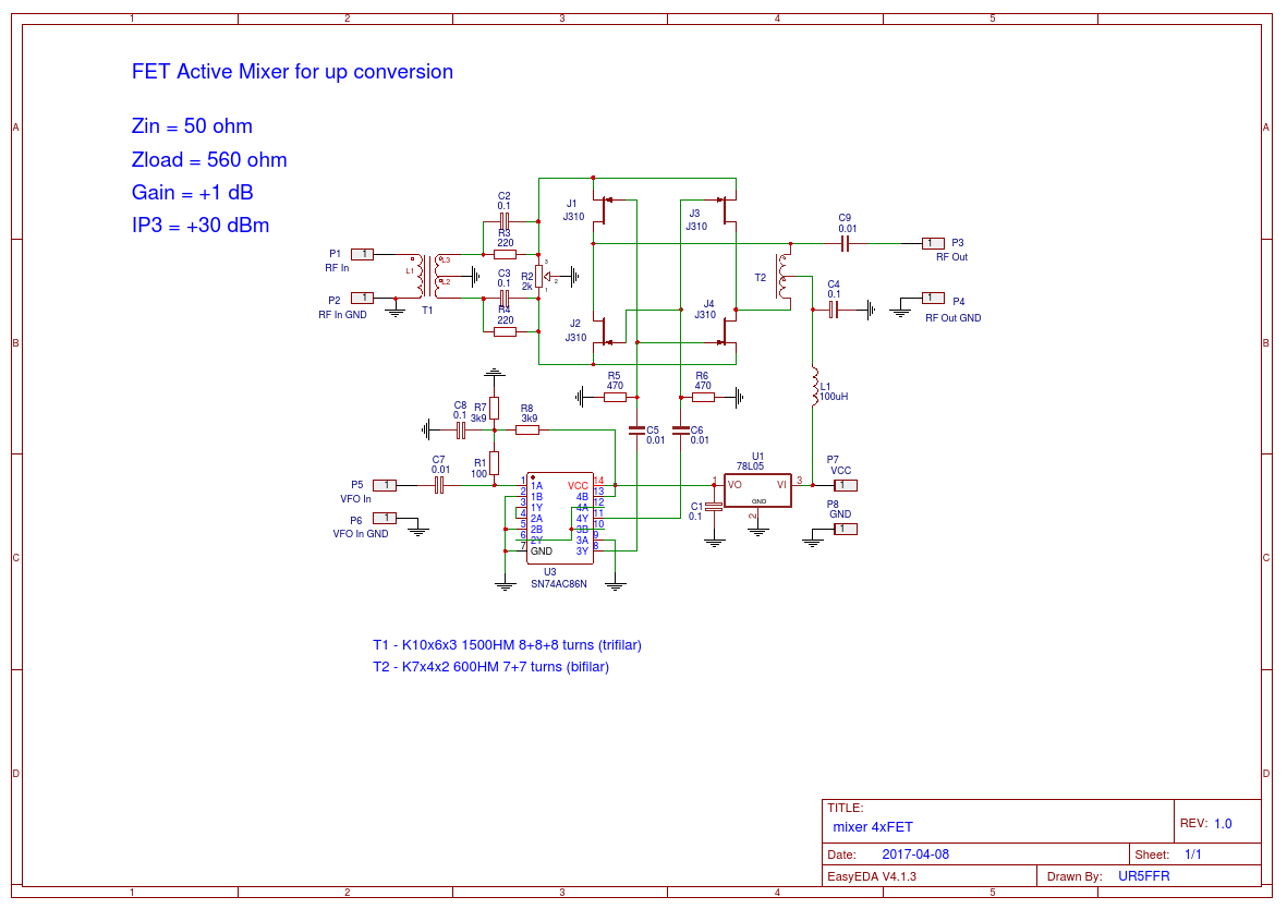 Характеристики приемного тракта очень сильно определяются примененным первым смесителем. Так как первый гетеродин работает в диапазоне частот 47..75 MHz то популярные в последнее время смесители на коммутаторах тут не особо применимы, т.к. из-за задержек переключения будут иметь повышенное затухание. Решено было использовать активный смеситель. Выбор пал на смеситель на четверке полевых транзисторов, аналогичный примененному в TS-590S и TenTec Orion II [1]. Использовалась четверка подобранных J310. Подбор осуществлялся китайским универсальным тестером "всего". Накачку ПТ осуществляет драйвер на 74AC86, который формирует сигнал на затворах в противофазе с достаточной амплитудой для надежного запирания транзисторов. В целом смеситель практически повторяет конструкцию из [2].