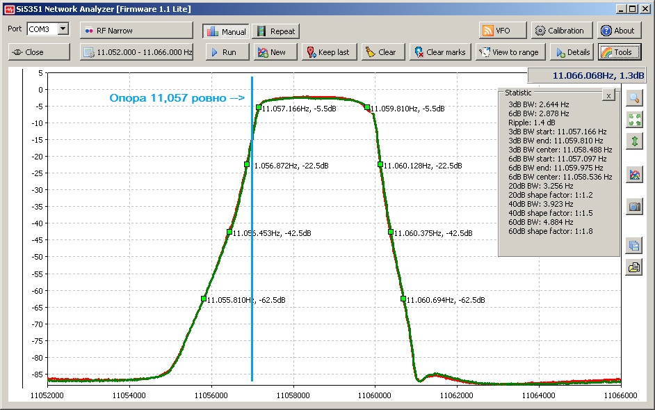 У меня получился вот такой кварцевый фильтр, на кварцах 11,059.2 с Али, с опорой ровно на 11,057.
