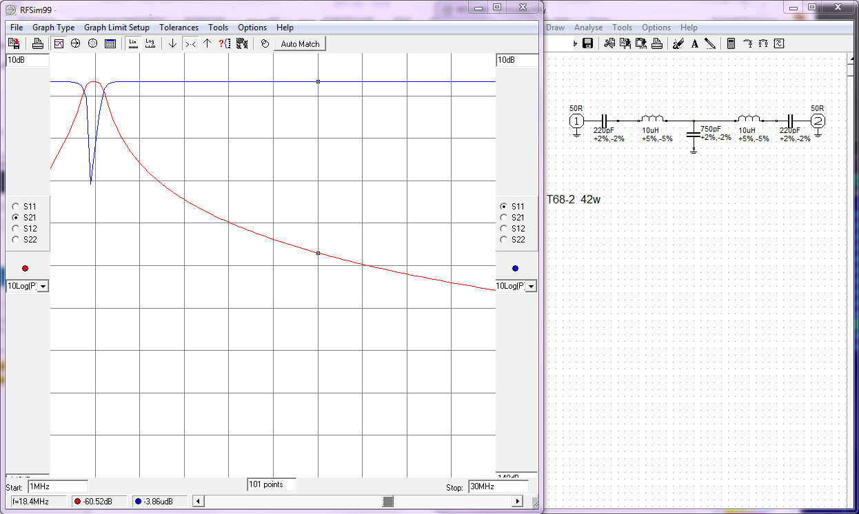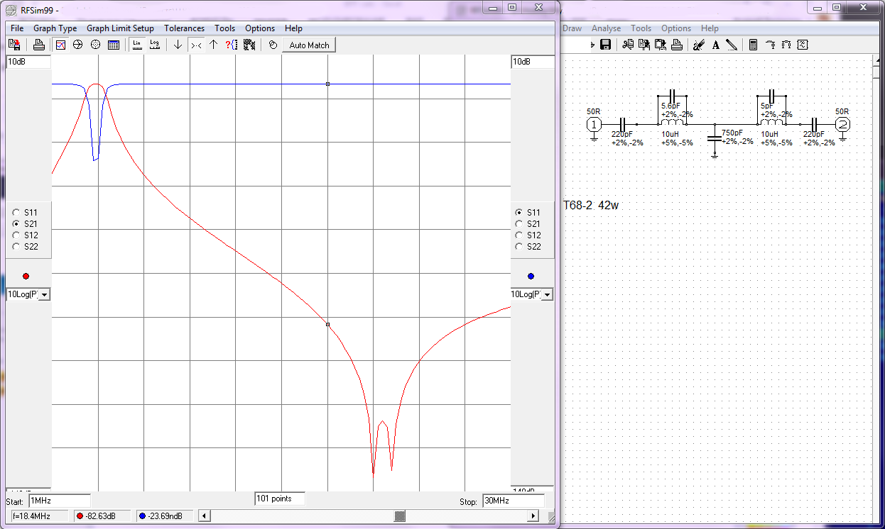 Дальнейшее увеличение индуктивности приводит к еще большему заужению полосы пропускания и уменьшению частоты бесконечного подавления. Ниже приведена АЧХ трехзвенного фильтра с индуктивностями 6.8uH (стандартный дроссель) - черная линия. Видно что частота бесконечного подавления уменьшилась до 23МГц