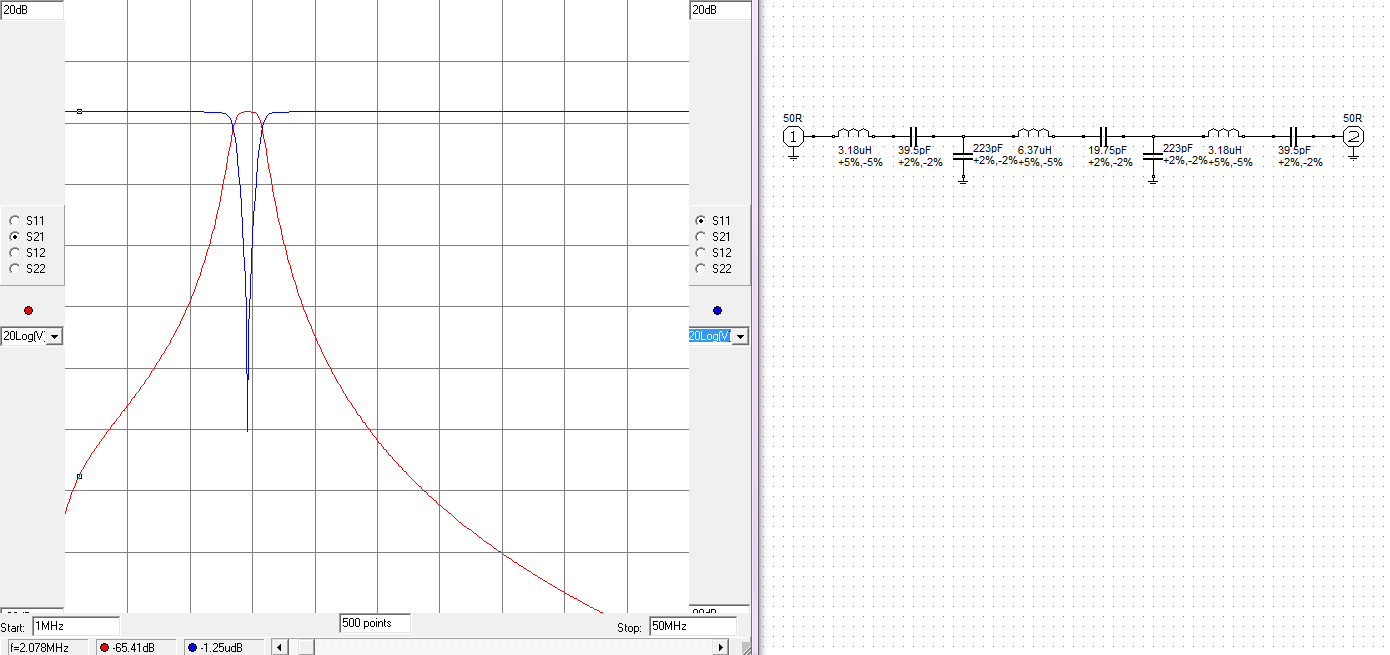 Видно что в среднем звене катушка имеет удвоенную индуктивность, а конденсатор - в два раза меньшую емкость. В некоторых случаях применение различных номиналов индуктивности может быть невозможным или нежелательным. Фильтр работает и в случае если индуктивность в среднем звене будет равна остальным. При этом емкость будет несколько выше расчетной. Полоса такого фильтра получается больше