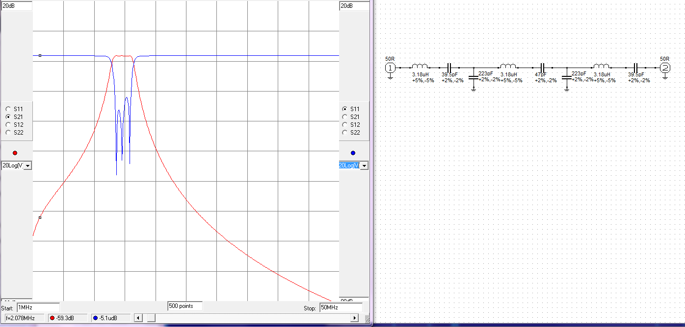 Практическая реализация вносит свои коррективы. Ниже приведены АЧХ фильтра 20ти метрового диапазона (частота 14МГц). Фильтр предназначен для использования в тракте с ПЧ 9МГц. Соответственно зеркальный канал расположен на частоте 32МГц. Имеет смысл рассчитывать фильтр исходя из критерия максимального подавления зеркального канала.