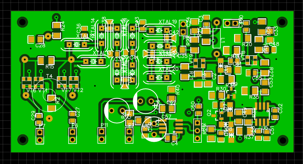 При использование кварцев в больших корпусах характеристическое сопротивление фильтра будет ниже (порядка 100-150ом) т.к. они имеют другой резонансный интервал. При этом необъодимо изменить номинал R21 на равный сопротивлению фильтра, а номинал R15 - примерно в 4 раза выше.