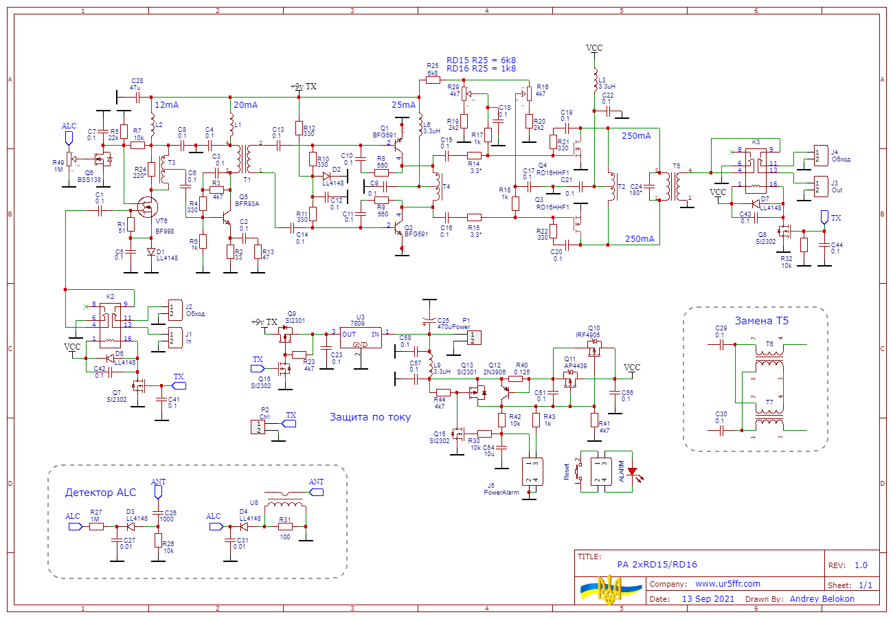В отличии от распространенных конструкций двухтактных усилителей мощности на RD16HHF1 в данном усилителе повышена чувствительность, введена цепь ALC и реализован модуль защиты усилителя по току. Изначально планировалось применить RD16HHF1, но более доступными оказались RD15HVF1 - на али можно купить недорого демонтаж который на 100% работоспособен. На RD15 и был собран этот усилитель, но нет никаких препятствий использовать в нем RD16.