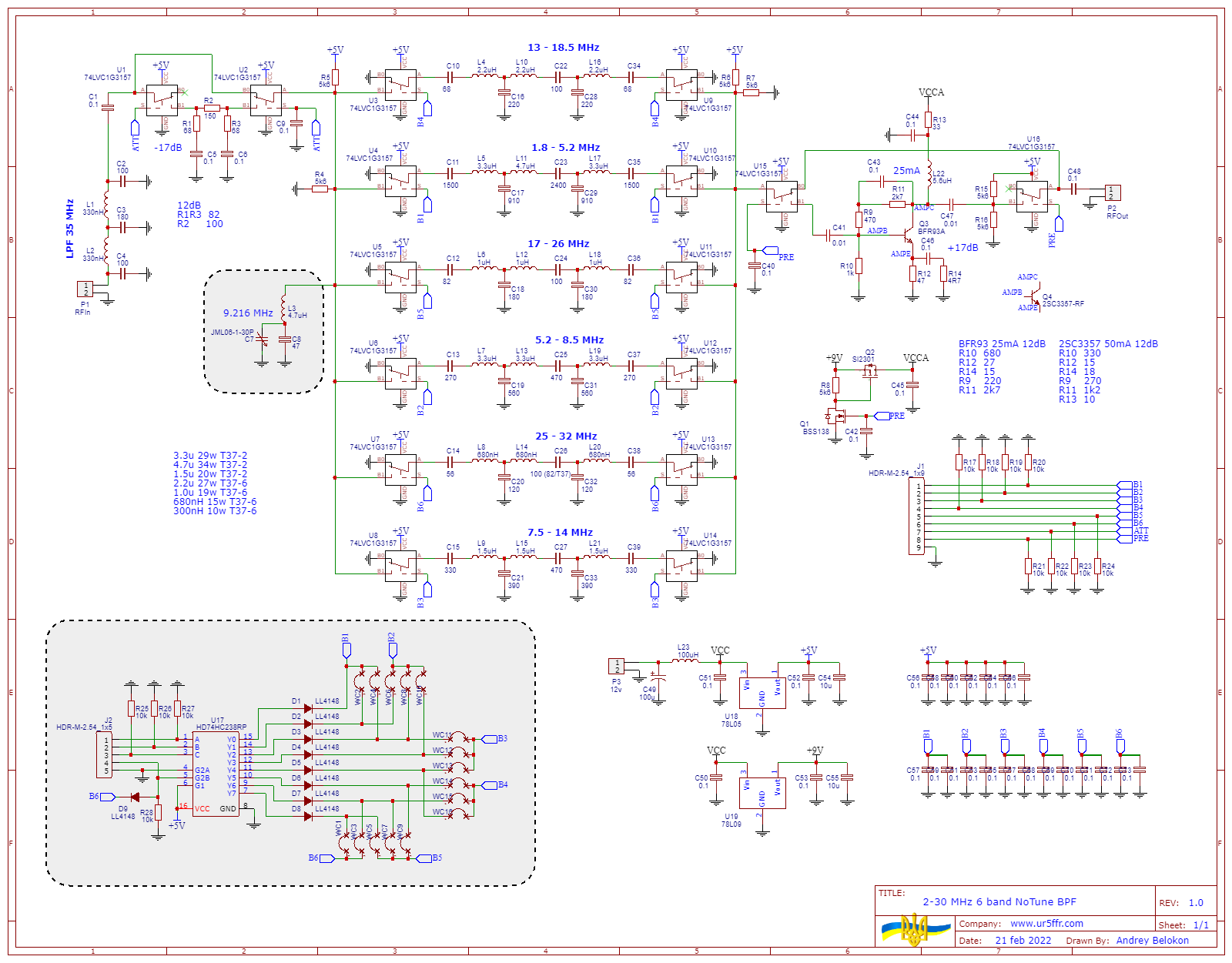 Фильтры выполнены по традиционной трехзвенной Т-образной топологии. Чтобы уменьшить взаимное влияние фильтры на соседние диапазоны максимально физически разнесены на плате.