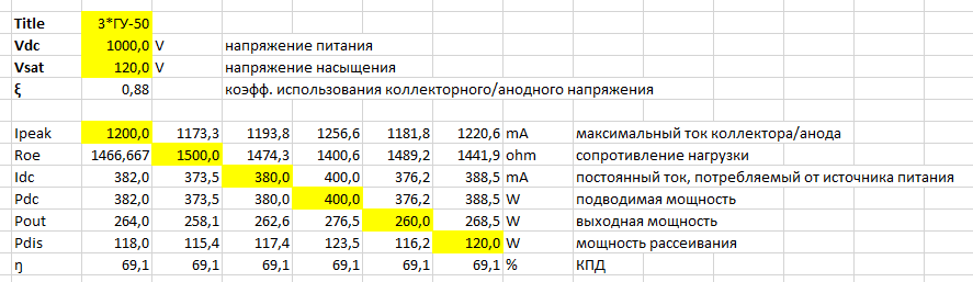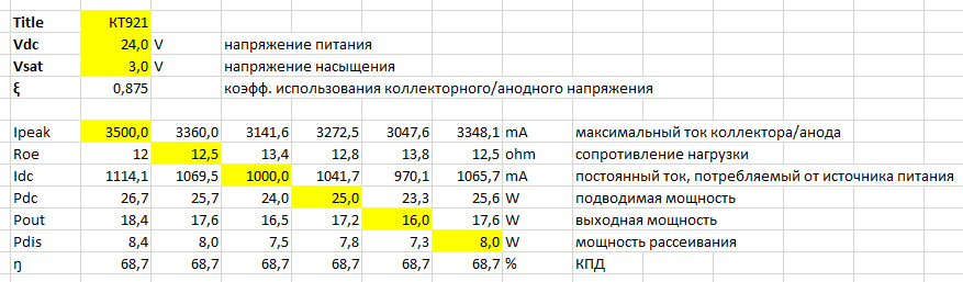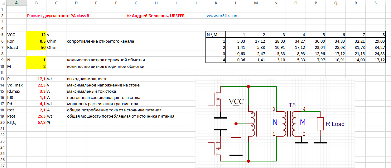 Таблицы excel для расчета основных энергетических параметров усилителей, работающих в классе B: