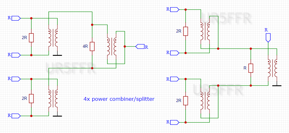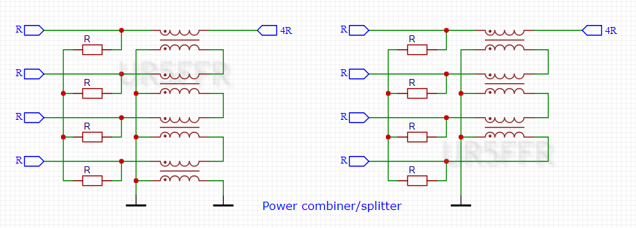 Пример практического применения - схема суммирования мощностей для усилителя мощностью 1kW с четырех блоков по 300W.