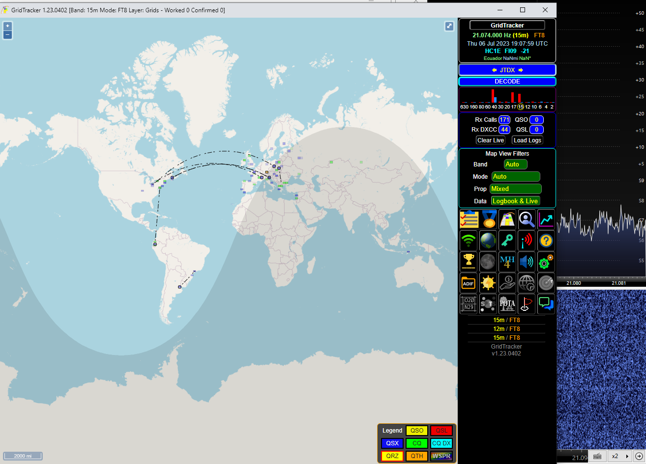 Не дивлячись на те що антенна начебто НЧ. На 15М був гарний прохід. Назбирав треків FT8 моди на RSP1 клон, без смугових фільтрів на вході, 06-07 липня 2023, мій локатор JN58TC: