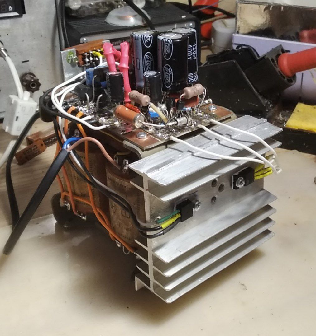 U2 FS5KM14A в пластиковом корпусе. Q3 стоит на радиаторе через изоляционную прокладку. Q1Q2 MPSA44 - любой высоковольтный. Q4 2N4401 - любой кремниевый.