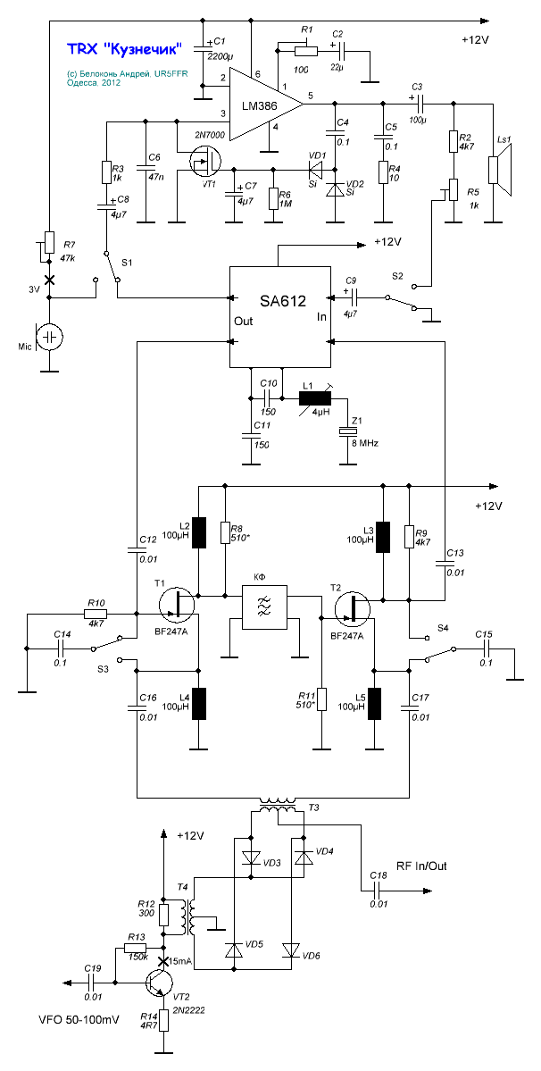 В атаче схема простого тракта, в котором нет реверсивных узлов, но в то же время все узлы используются как в режиме RX, так и в TX. Еще одним немаловажным преимуществом является хорошее согласование КФ по входу/выходу. Схема не макетировалась, но используются различные узлы, отмакетированные мной ранее отдельно либо в составе других конструкций.