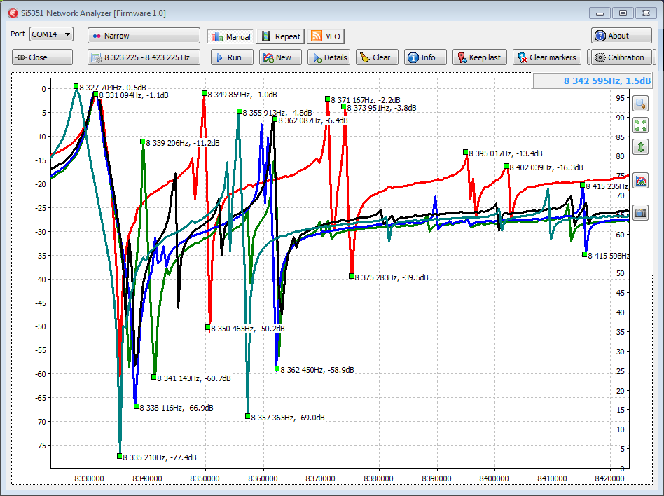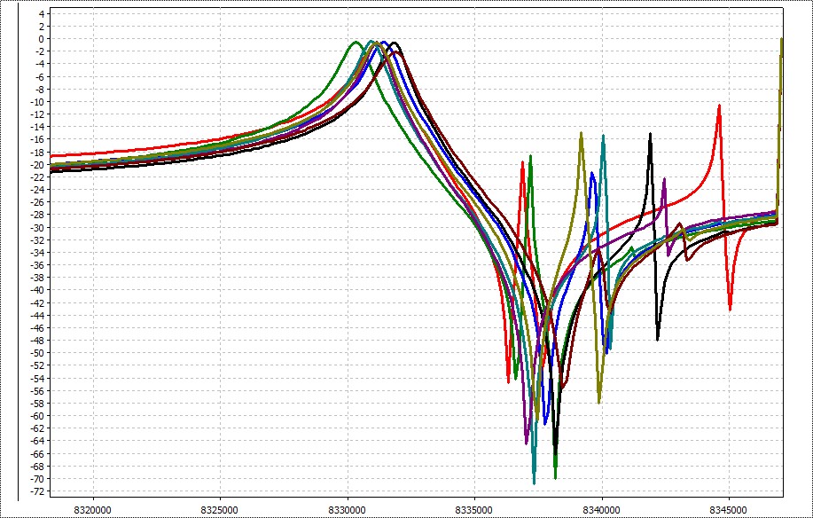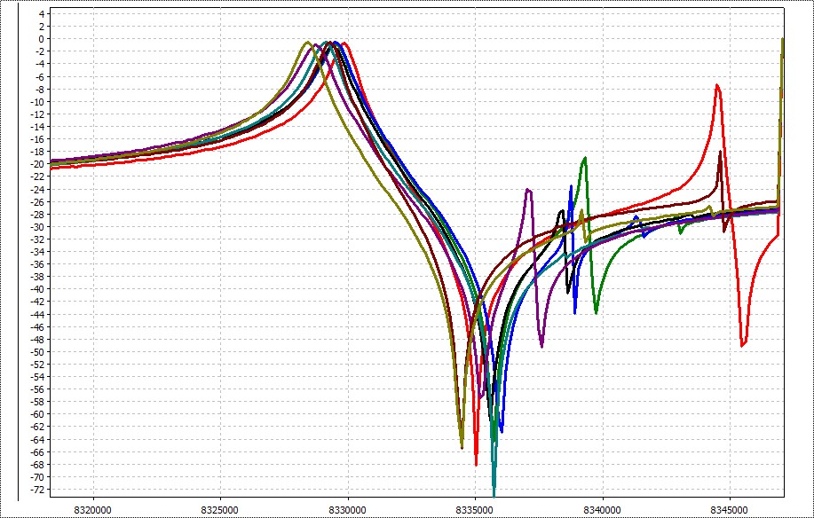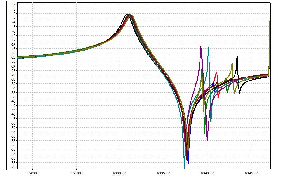 Например из коробки с 40-ка резонаторами на частоту 8.320MHz была выбрана группа из 8-ми кварцев только с учетом частот резонансов: