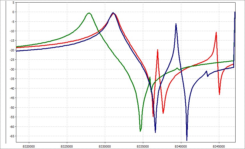 Как я показывал в [1] достаточно легко делается QER кварцевый фильтр из китайских резонаторов взятых из одной партии без какого-то нибыло отбора по параметрам. Со старыми кварцами времен эсесер, разных партий и годов выпуска, а тем более с карболитовыми от РСИУ такой "фокус" не проходит. Причина - существенный разброс характеристик и наличие паразитных резонансов расположенных в резонансном интервале либо очень близко к нему [2]. Например вот АЧХ трех карболитовых кварцев на 8.320 MHz.