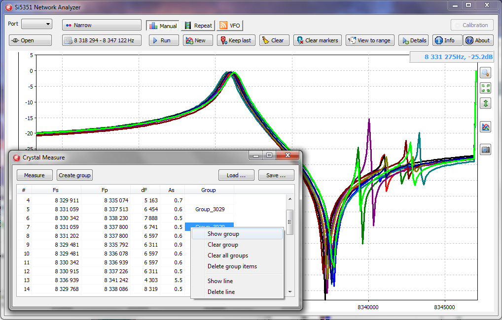 Правый клик мыши на таблице позволяет отобразить графики АЧХ резонаторов из выбранной группы и осуществить другие операции.