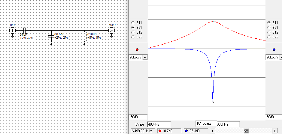 Будем исходить из того, что параллельно входу фильтра подключим параллельный колебательный контур. Зададимся значением индуктивности 3.3uH из стандартного ряда. Соответственно емкость должна быть 67pF.