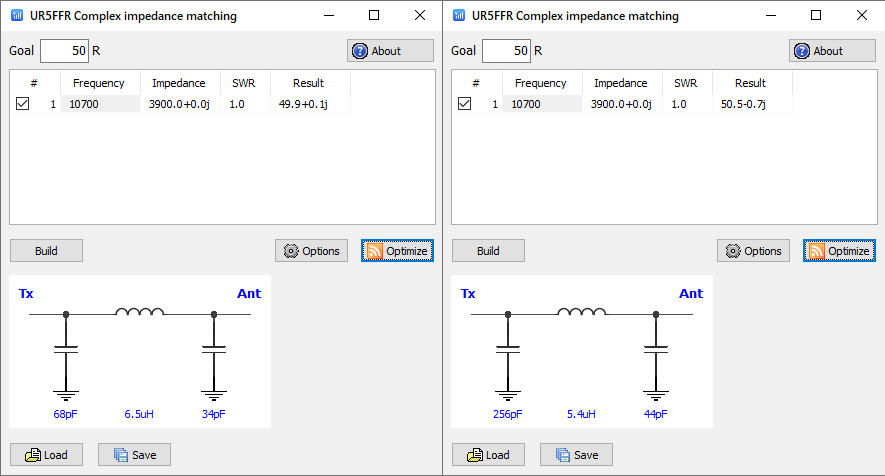 Более сложные топологии требуют запуска оптимизатора. Построим цепь согласования в виде П-контура. Нажмем Buid и выберем "Classic Pi"