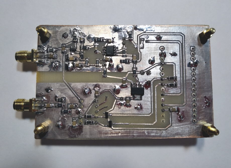 Принцип работы остался неизменный - супергетеродинный метод измерений, но схемотехника претерпела существенные изменения. ПЧ была выбрана в звуковом диапазоне - 1кГц. Это позволило отказаться от керамических фильтров и применить вместо них активный фильтр на ОУ. При столь низкой частоте ПЧ амплитуду сигнала может измерять микроконтроллер с помощью АЦП - его ресурсов вполне хватает для реализации алгоритма Герцеля. Таким образом был исключен из схемы труднодоставаемый AD8307.