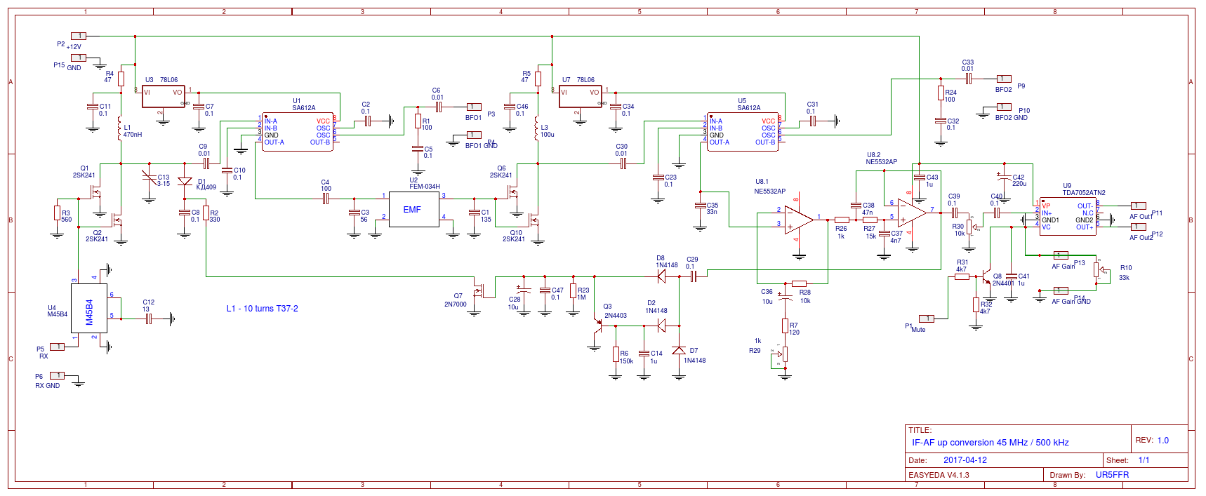 Тракт ПЧ-НЧ сделан по мотивам трансивера "Стрекоза" [3]. После смесителя сигнал с ПЧ 45 MHz попадает на кварцевый фильтр. Я применил фильтры M45B4 с полосой пропускания 7.5 kHz, но могут быть применены любые промышленные фильтры на соответствующие частоты и импедансом порядка 400-600 ом. Например 45K15B или аналогичные. Фильтр согласован по выходу с помощью резистора R13, сопротивление которого равно рекомендуемому сопротивлению нагрузки для примененного фильтра.