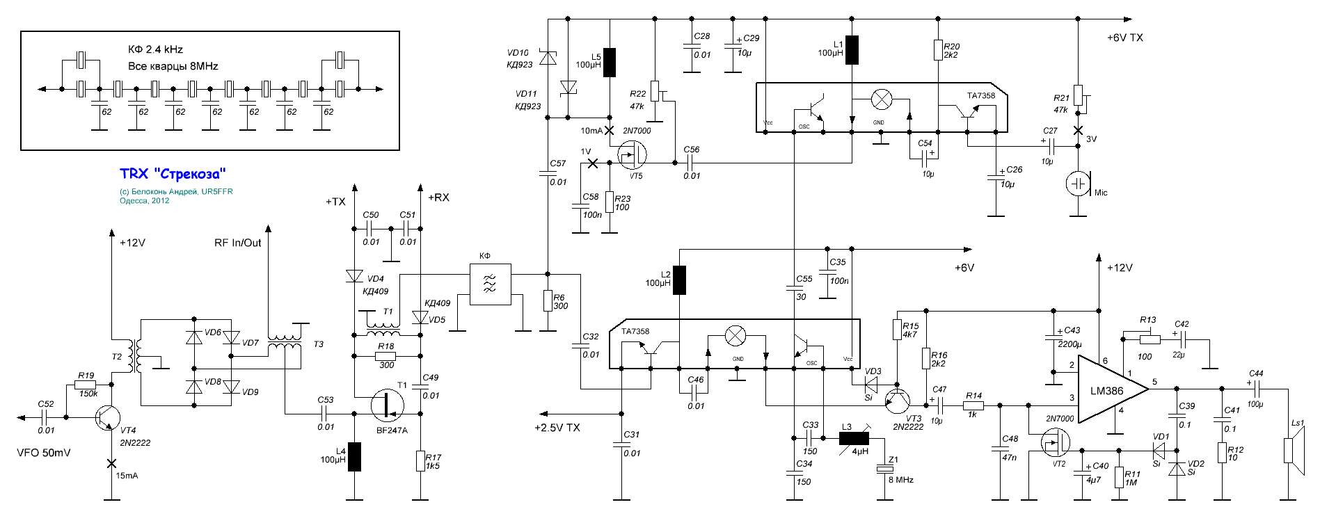 Было опробовано несколько разных схемотехнических решений для различных узлов. Среди них были и достаточно экзотические, как например УНЧ на регулируемом стабилизаторе TL431 с Кус=60дБ. При этом общая концепция построения тракта не менялась - реверсивный смеситель+УПЧ и раздельные тракты RX/TX после кварцевого фильтра.