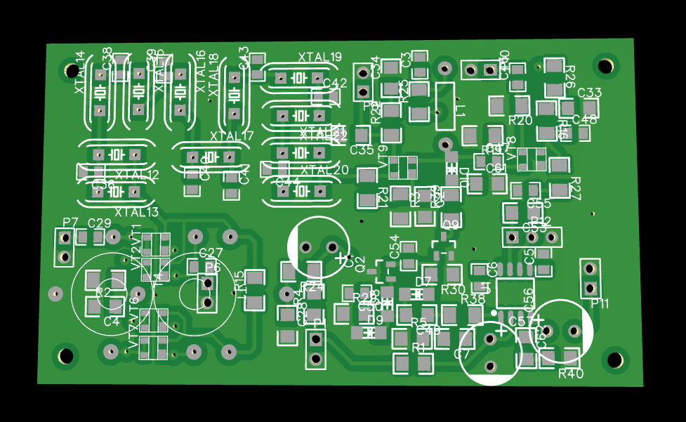 При использование кварцев в больших корпусах характеристическое сопротивление фильтра будет ниже (порядка 100-150ом) т.к. они имеют другой резонансный интервал. При этом необъодимо изменить номинал R21 на равный сопротивлению фильтра, а номинал R15 - примерно в 4 раза выше.