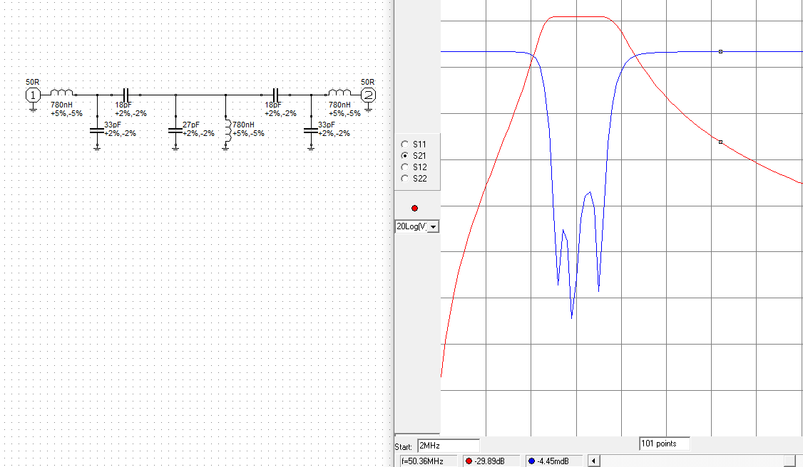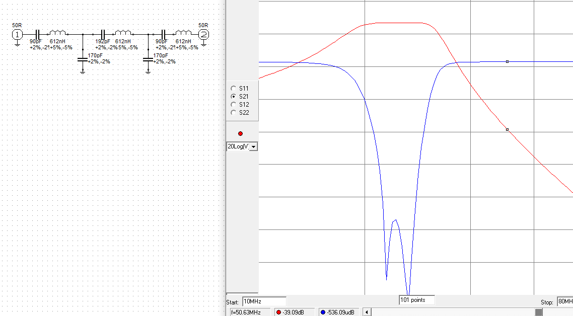 Опять же - промоделируйте в рфсимм - все как на ладони. На 50МГц подавление -30дб, что на 10дб ХУЖЕ чем в Т-образном фильтре. Это свойство топологии - параллельные контура приводят к более крутым левым скатам фильтра, а последовательные - к правым. Нам и в суперах и в сдр надо давить то что справа - там либо зеркалка либо побочный канал приема. Это раньше гетеродин из-за проблем со стабильностью выбирали как можно ниже, в результате чего зеркалка могла лежать ниже чем частота приема, и тогда классика жанра - параллельные контура со слабой связью это наше все. Но сейчас все на синтезаторах и ГПД всегда "сверху", а зеркалка еще выше. Поэтому я у себя во всех конструкциях стараюсь этот момент учитывать.