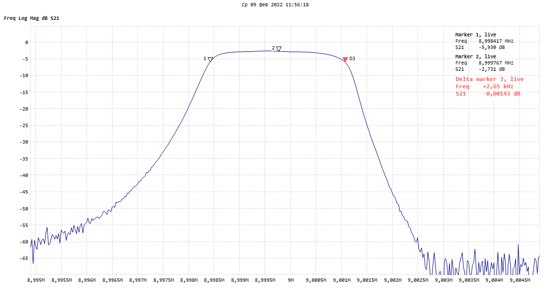 Ну в общем такой получился фильтр. Затухание в полосе пропускания около 2,7 дБ. Согласование - два резистора по 250 ом, калибровал nanovna на 0 дБ с ними же. Для этой полосы пропускания конденсаторы поставил на 47 пик. Это уже запаянный в основную плату второй фильтр (между T2 и T4), первый должен получиться даже чуть лучше. Андрей, нормальный фильтр? не будет чувствительность занижена из за него?