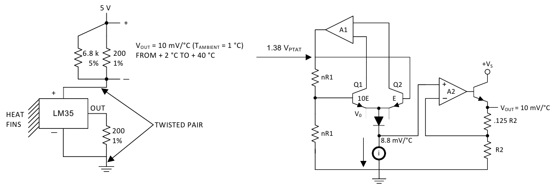 Чтобы понять как она работает посмотрим на внутренности LM35 справа. Сама LM35 потребляет очень маленький ток. Если мы ее выход нагрузим на сравнительно низкоомный резистор, то потребляемый ею ток будет практически полностью зависеть от температуры. Включив в разрыв положительного провода питания резистор, мы преобразуем этот ток в напряжение относительно плюса источника питания.
