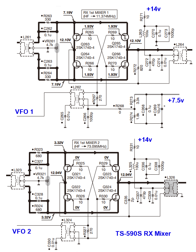 Оба смесителя "накачиваются" в затворы синусоидальным напряжением гетеродина уровнем +18dBm что на сопротивлении 70R соответствует примерно 3Vpeak. Резисторы с номиналом 10R в цепи затворов являются антипаразитными. Достаточно низкие сопротивления в цепи гетеродина R267/R327 равные 270R необходимы для нивелирования емкости затвора примененных полевых транзисторов 2SK1740 которая составляет 11pF (для сравнения у J310 эта емкость почти в 3 раза ниже и равна 4pF).