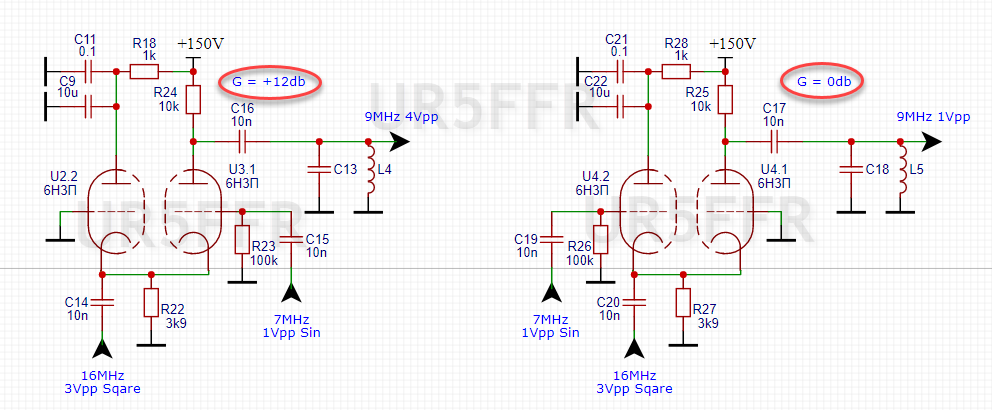 Схема на первый взгляд выглядит несколько странно. Правый триод выглядит "лишним" - вроде как он ничего не делат. А вот нет - если его исключить то мы получим обычный смеситель на одном триоде с подачей гетеродина в катод. Его усиление порядка -3дб - я это проверял экспериметально. То есть триод что-то все же делает.