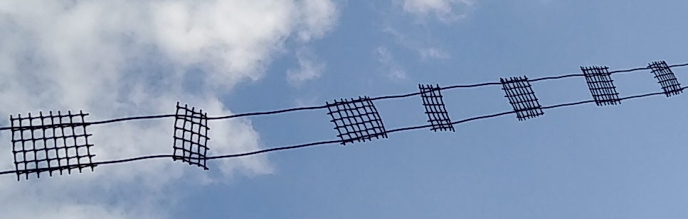 Мне нужна была линия с расстоянием между проводами 4см. Сетка была нарезана на кусочки с размерами 5*7 ячеек. В эти распорки была продета полевка. Каждый провод продевается несколько раз по стороне, чтобы распорка перемещалась вдоль него с трением.
