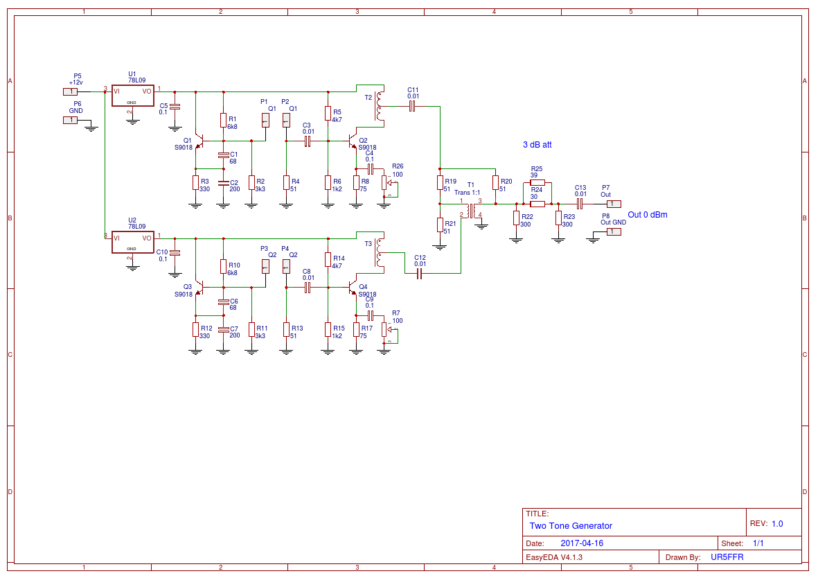 Настройка. Поочередно закорачивая базы Q1/Q3 на землю срываем генерацию одного из генераторов и выставляем амплитуду сигнала на выходе для другого генератора с помощью подстроечных резисторов R7R26. Возможно придется изменить их номиналы - это связанно с активностью примененных кварцев. Для 0 dBm выставляем амплитуду одного тона на выходе равную 224 mV.