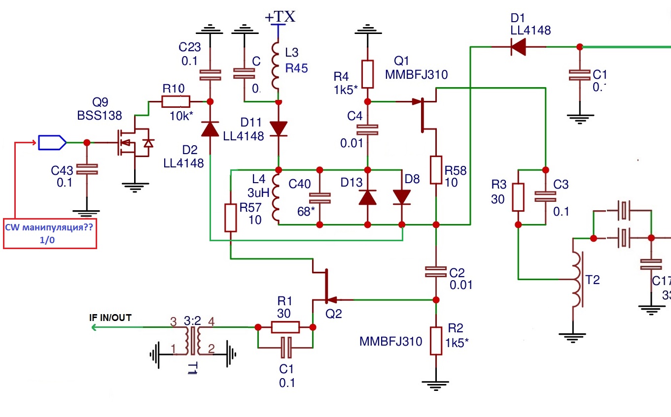 Диод D2 поключить к R58C2. Тоесть ару будет как alc работать. На вход подавать не сигнал ару (AGC) а сигнал ключевания. Постоянная времени R10C23 будет определять длительность спада/нарастания трапеции - ее надо будет только немного переделать. 10к+0,1u даст порядка 1мсек или меньше. Управление инверсное. Тоесть когда на затворе BSS138 плюс он открыт и сигнала не проходит. По затвору для открытия давать логиечский уровень 0/1 или выше вплоть до Uпит