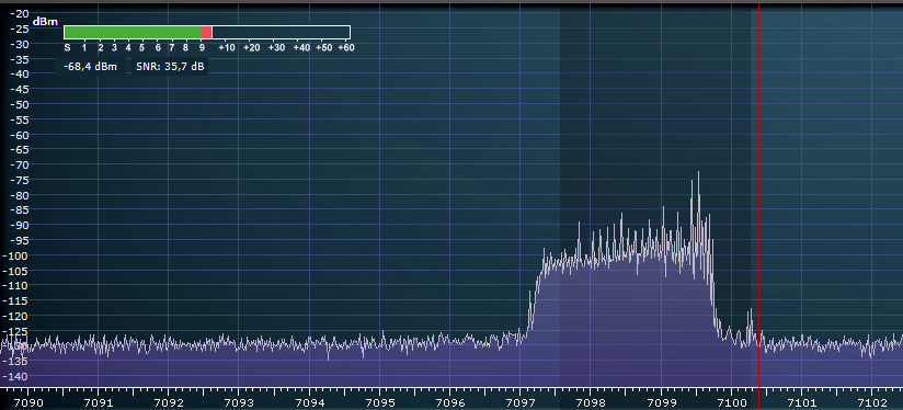 Чтобы убедиться что тракт всетаки включен на передачу коснулся пальцем микрофонного входа :) На выходе появился сигнал. Остатков несущей на частоте 7100kHz нет